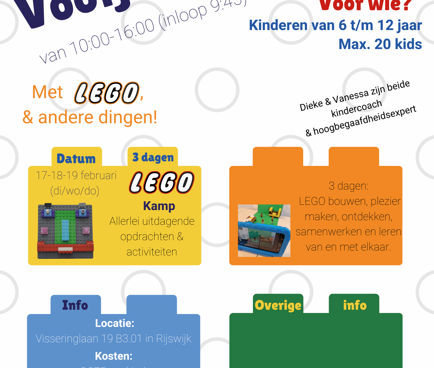 Tijdens de kampweek in de voorjaarsvakantie gaan we lekker bouwen met LEGO®, verhalen vertellen, plezier maken, samenwerken en leren van en met elkaar. We gebruiken verschillende materialen en zorgen voor voldoende uitdaging voor alle kinderen.